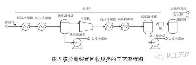 膜分離裝置設于高壓冷凝器之后,緩沖罐前,由于排放氣壓縮機能力不足,只有一部分氣體經過膜分離裝置,其他部分直接進入緩沖罐,滲透氣返回至低壓冷卻器前,尾氣進入緩沖罐。